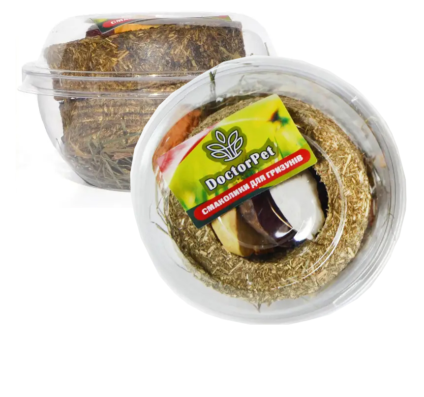 Смаколики в круглій пластиковій коробці, 1 шт (сіно,кільце з сіна,крекер,крейда), Doctor Pet