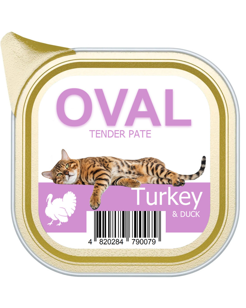 Паштет з індичкою та качкою, OVAL – це неперевершений смак та користь організму вашого улюбленця. М'які м'які текстури. На сто відсотків лише свіже м'ясо без додавання консервантів, підсилювачів смаку та аромату. Корм виготовлений із інгредієнтів, призначених для харчування людини. Повністю збалансований раціон з мінералами та вітамінним комплексом.