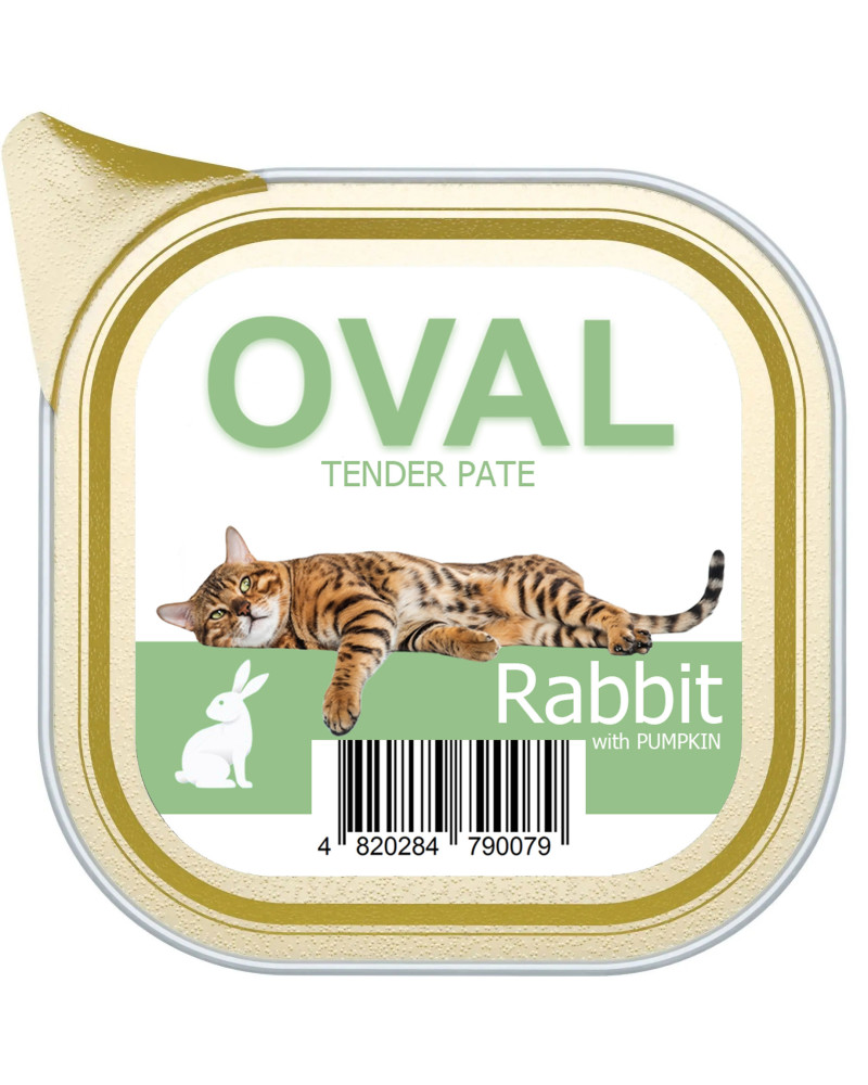 Паштет з м'ясом кролика та гарбузом, OVAL – це неперевершений смак та користь організму вашого улюбленця. М'які м'які текстури. На сто відсотків лише свіже м'ясо без додавання консервантів, підсилювачів смаку та аромату. Корм виготовлений із інгредієнтів, призначених для харчування людини. Повністю збалансований раціон з мінералами та вітамінним комплексом.