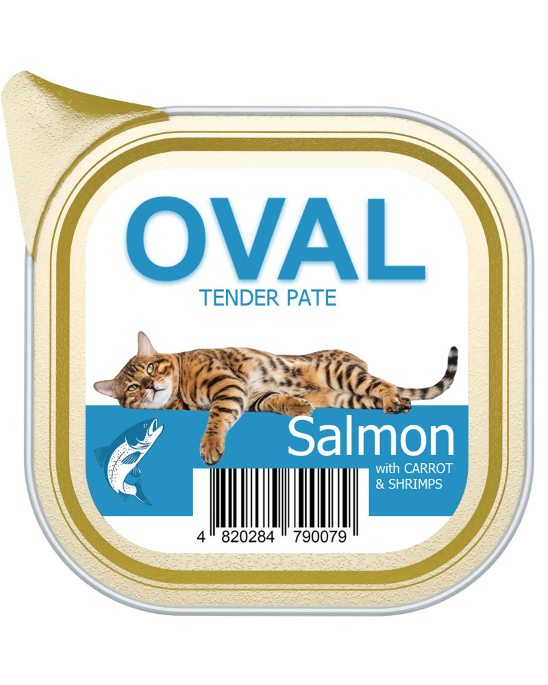 Паштет з тихоокеанським лососем, морквою та креветками, OVAL – це неперевершений смак та користь організму вашого улюбленця. М'які м'які текстури. На сто відсотків лише свіже м'ясо без додавання консервантів, підсилювачів смаку та аромату. Корм виготовлений із інгредієнтів, призначених для харчування людини. Повністю збалансований раціон з мінералами та вітамінним комплексом.