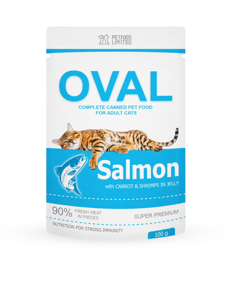 Вологий корм з лососем, морквою та креветками в желе, OVAL – це неперевершений смак та користь організму вашого улюбленця. М'які м'які текстури. На сто відсотків лише свіже м'ясо без додавання консервантів, підсилювачів смаку та аромату. Корм виготовлений із інгредієнтів, призначених для харчування людини. Повністю збалансований раціон з мінералами та вітамінним комплексом