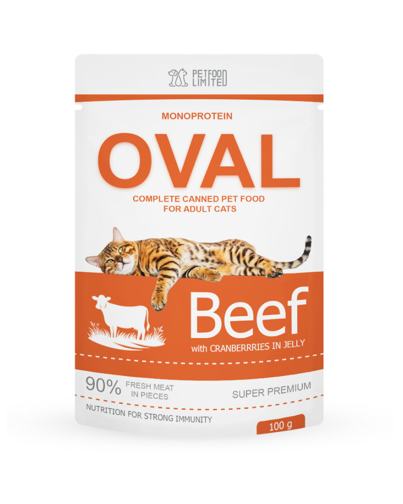Вологий корм з яловичиною та журавлиною у желе, OVAL – це неперевершений смак та користь організму вашого улюбленця. М'які м'які текстури. На сто відсотків лише свіже м'ясо без додавання консервантів, підсилювачів смаку та аромату. Корм виготовлений із інгредієнтів, призначених для харчування людини. Повністю збалансований раціон з мінералами та вітамінним комплексом.