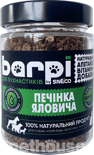 Натуральна харчова добавка у вигляді сушеної та подрібненої яловичої печінки для собак усіх порід та вікових груп. Апетайзер є чудовим доповненням до раціону для поліпшення апетиту та смакових властивостей сухого корму чи натуральної їжі.