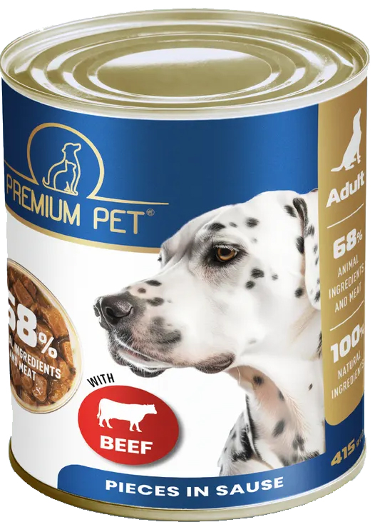 Шматочки в соусі з яловичиною Premium Pet – це повнораціонний консервований корм для дорослих собак.